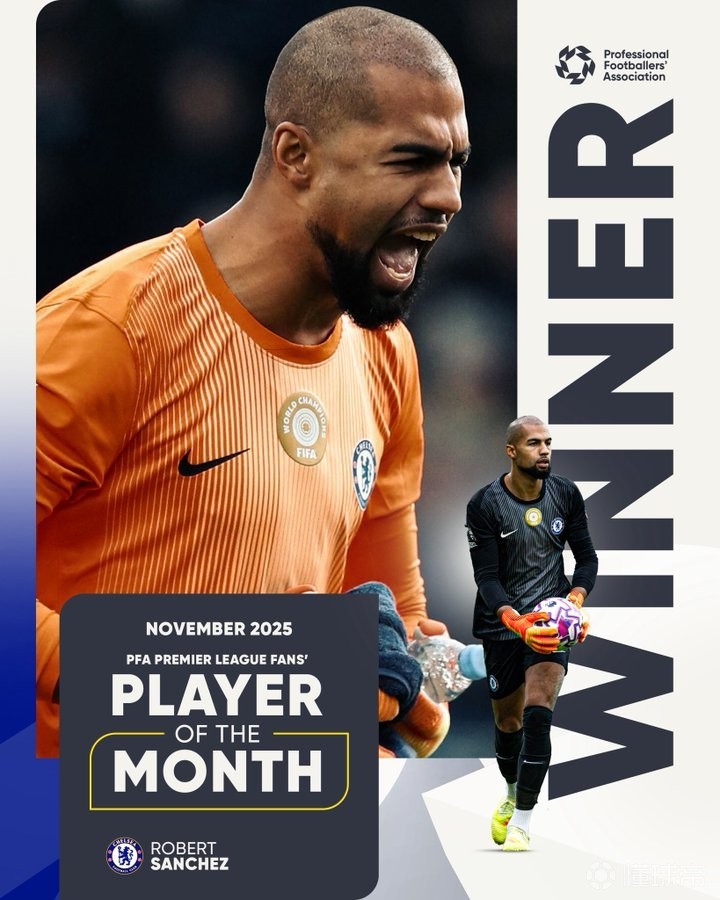 官方信息顯示,切爾西門將羅伯特-桑切斯獲選PFA(英格蘭職業(yè)足球運(yùn)動(dòng)員協(xié)會(huì))英超球迷票選的11月最佳球員。