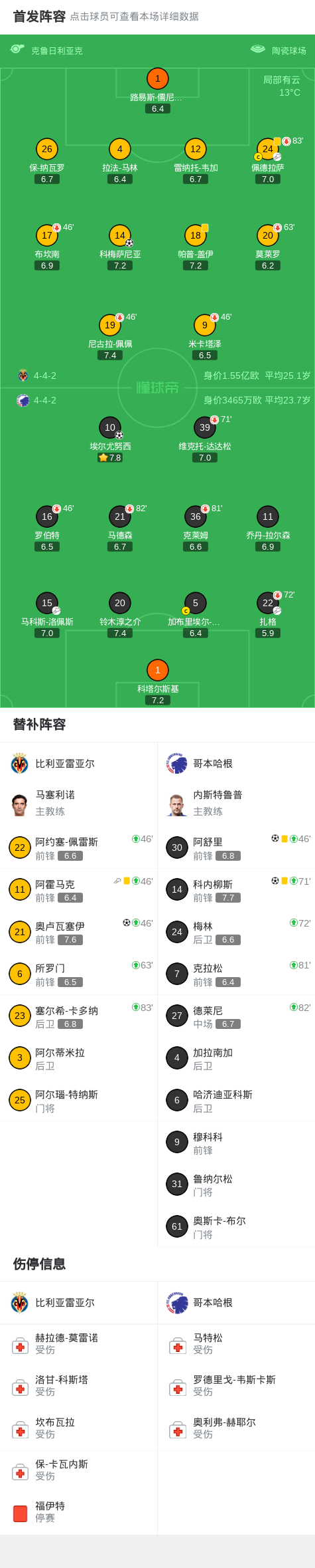 比利亞雷亞爾2-3哥本哈根,科內柳斯制勝,埃爾尤努西閃擊